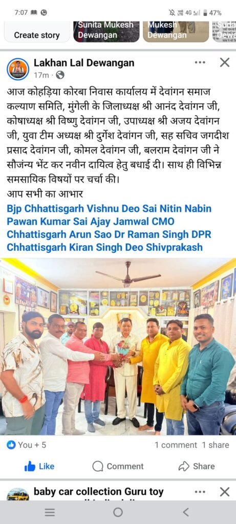 भेंट-मुलाकात में समाज के प्रतिनिधियों ने पचरी निर्माण की स्वीकृति प्रदान करने एवं समाजहित में संवेदनशील निर्णय लेने के लिए मंत्री लखन लाल देवांगन का आभार व्यक्त किया। समाजजनों ने विश्वास जताया कि मंत्री के मार्गदर्शन एवं सहयोग से आने वाले समय में देवांगन समाज के उत्थान एवं जिले के सर्वांगीण विकास की दिशा में उल्लेखनीय कार्य होंगे।