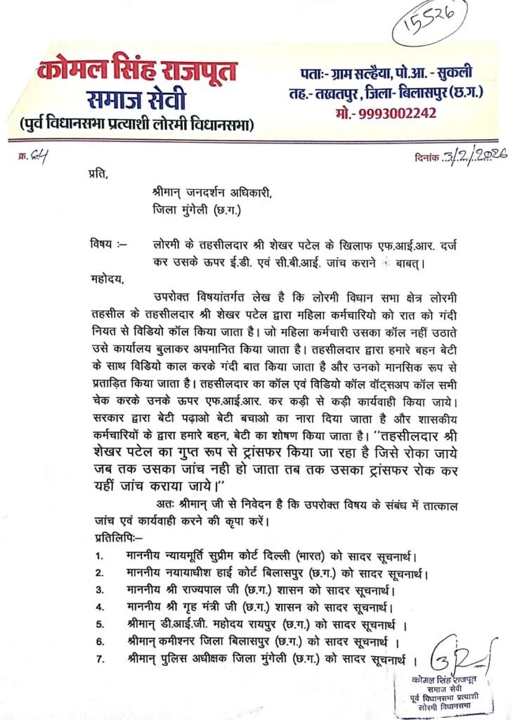 राजनीति के केंद्र बिंदु और ‘हॉटस्पॉट’ कहे जाने वाले लोरमी विधानसभा में एक ईमानदार छवि के अधिकारी को बदनाम करने की साजिश अब उलटी पड़ती दिखाई दे रही है। कुछ दिनों पूर्व विधानसभा लोरमी के तथाकथित समाज सेवक कोमल सिंह राजपूत, निवासी सल्हैया के द्वारा सोशल मीडिया और अन्य प्रकार से तहसीलदार शेखर पटेल के खिलाफ भ्रामक दुष्प्रचार किया गया। पिछले दस वर्षों के रिकॉर्ड में लगातार दो वर्षों से अपनी निष्पक्ष और पारदर्शी कार्यशैली के लिए पहचाने जाने वाले तहसीलदार शेखर पटेल ने अपनी छवि धूमिल करने की कोशिश करने वाले तथाकथित समाजसेवकों के खिलाफ मोर्चा खोल दिया है।