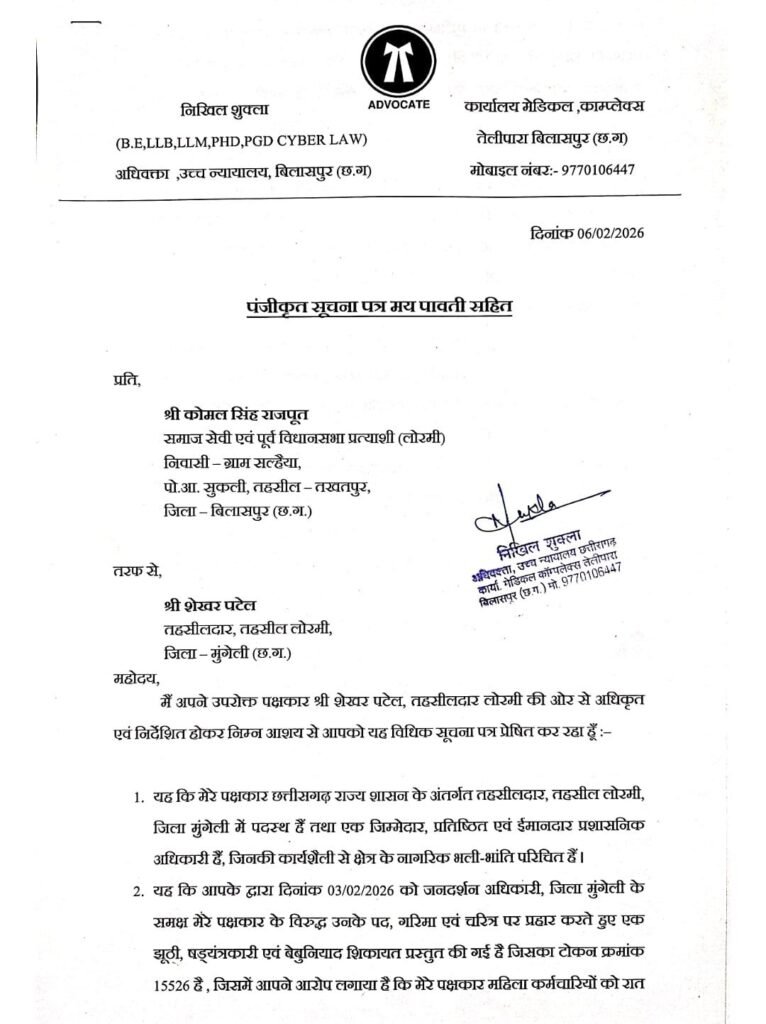 अधिवक्ता निखिल शुक्ला के माध्यम से भेजे गए विधिक नोटिस में तहसीलदार शेखर पटेल ने कड़ा रुख अपनाते हुए लीगल नोटिस दिया है कि आरोप पूरी तरह झूठे, षड्यंत्रकारी और तथ्यहीन हैं। बिना किसी प्रमाण के सार्वजनिक रूप से छवि खराब करना भारतीय न्याय संहिता (BNS), 2023 की धारा 356 (मानहानि) के तहत दंडनीय अपराध है।