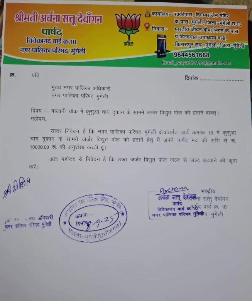 विवेकानंद वार्ड पार्षद श्रीमती अर्चना सत्तू देवांगन ने बालानी चौक में स्थित जर्जर विद्युत पोल को हटाने की दिशा में कदम बढ़ाते हुए नगर पालिका पार्षद मद से 10,000 रुपये की अनुशंसा प्रदान की है। इस संबंध में पार्षद प्रतिनिधि सत्तू देवांगन ने जानकारी देते हुए बताया कि मुख्य नगरपालिका अधिकारी को पत्र लिखकर इस पोल को तत्काल हटाने की मांग की गई है। पत्र में स्पष्ट उल्लेख किया गया है कि कुसुवा चाय दुकान के सामने वर्षों से खड़ा यह पोल कभी भी गिर सकता है और राहगीरों व आसपास के निवासियों की जान को खतरा है। देवांगन ने कहा कि यदि समय रहते इस पोल को नहीं हटाया गया और किसी प्रकार की अप्रिय घटना होती है, तो उसकी पूरी जिम्मेदारी प्रशासन और विद्युत विभाग की होगी। उन्होंने नगर पालिका प्रशासन से आग्रह किया है कि आवंटित बजट का उपयोग कर शीघ्र कार्यवाही की जाए और नागरिकों को राहत दी जाए। स्थानीय लोगों का कहना है कि शहर में ऐसे कई स्थानों पर जर्जर पोल खड़े हैं, जिनकी समय-समय पर शिकायतें की जाती रही हैं, लेकिन विभागीय उदासीनता के कारण अब तक ठोस कदम नहीं उठाया गया। लोगों ने प्रशासन से मांग की है कि किसी बड़े हादसे का इंतजार करने के बजाय सभी जर्जर खंभों की सूची बनाकर प्राथमिकता के आधार पर उन्हें हटाया जाए।